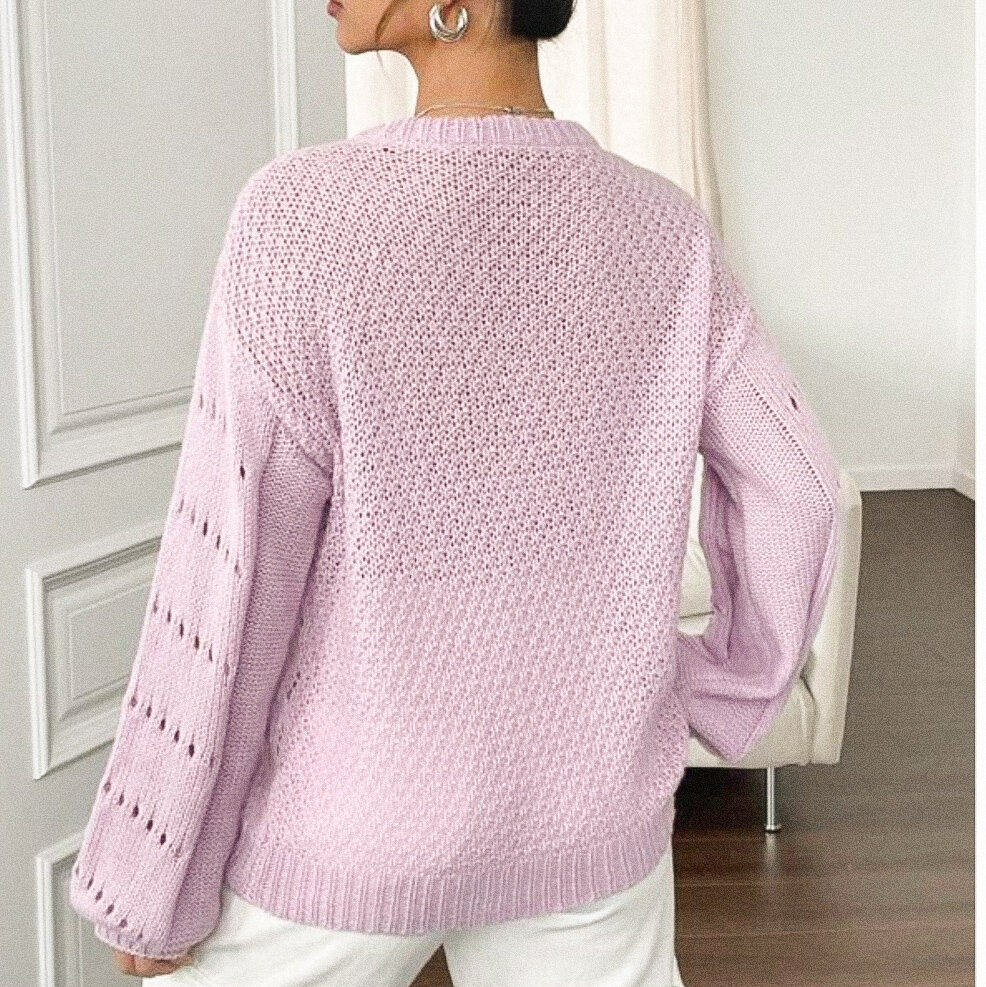 На изображении женщина стоит спиной к камере, одетая в розовый вязаный свитер с декоративными отверстиями на рукавах. Она находится в помещении с белыми стенами и дверным проемом.