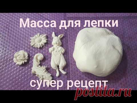 На фотографии представлены материалы для лепки: кусок белой массы для лепки и несколько сформированных фигурок, включая фигурку зайца и цветы. Фон изображения - фиолетовая поверхность с текстурой. На изображении также есть текст, дающий понять, что это масса для лепки с каким-то рецептом или указанием на возможность использования.