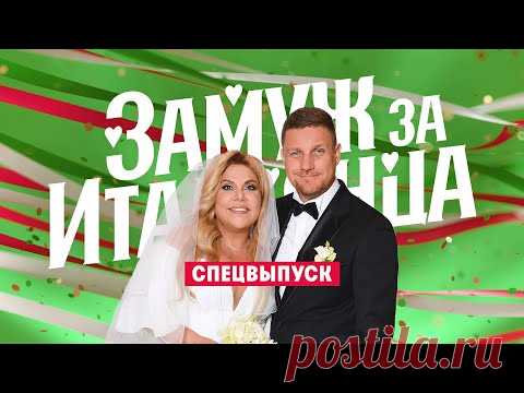 На изображении видна свадебная пара. Жених в черном костюме и невеста в белом свадебном платье позируют на фоне цветной надписи "ЗАМУЖ ЗА ИТАЛЬЯНЦА СПЕЦВЫПУСК". Фон оформлен в зелено-красные тона с белыми разводами, что напоминает итальянский флаг.