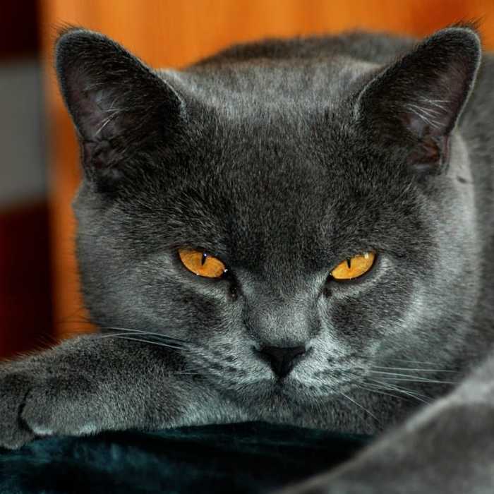 Серый кот с оранжевыми глазами лежит и смотрит прямо на камеру.