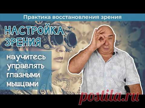 На изображении представлена реклама методик по восстановлению зрения. Мужчина сжимает веки, имитируя упражнение для глаз. Текст на изображении гласит: "Настройка зрения", "Научитесь управлять глазными мышцами". Фон украшен изображениями винтажных очков и узоров.
