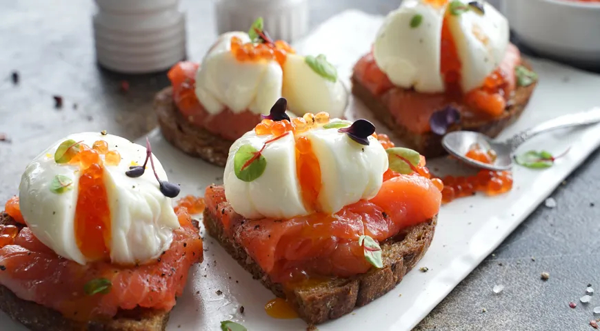 - Распределите поджаренный хлеб по тарелкам. На каждую выложите ломтики рыбы и поперчите. Выньте мешочки с яйцами из воды, аккуратно срежьте узелки и поместите яйца на рыбу. Украсьте красной икрой.