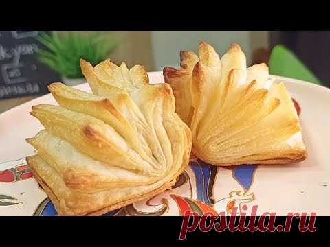 На изображении представлены два слоеных десерта в форме веера на тарелке с узором. Эти выпечные изделия имеют золотистый цвет и расслоенную текстуру, характерную для слоеного теста.