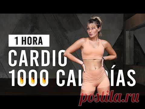 На изображении женщина в спортивной одежде. Верхний текст говорит "1 HORA CARDIO 1000 CALORÍAS", что предполагает тренировку по сжиганию калорий. Дизайн подразумевает фитнес-контент, возможно, обложка видео о фитнесе или тренировке.