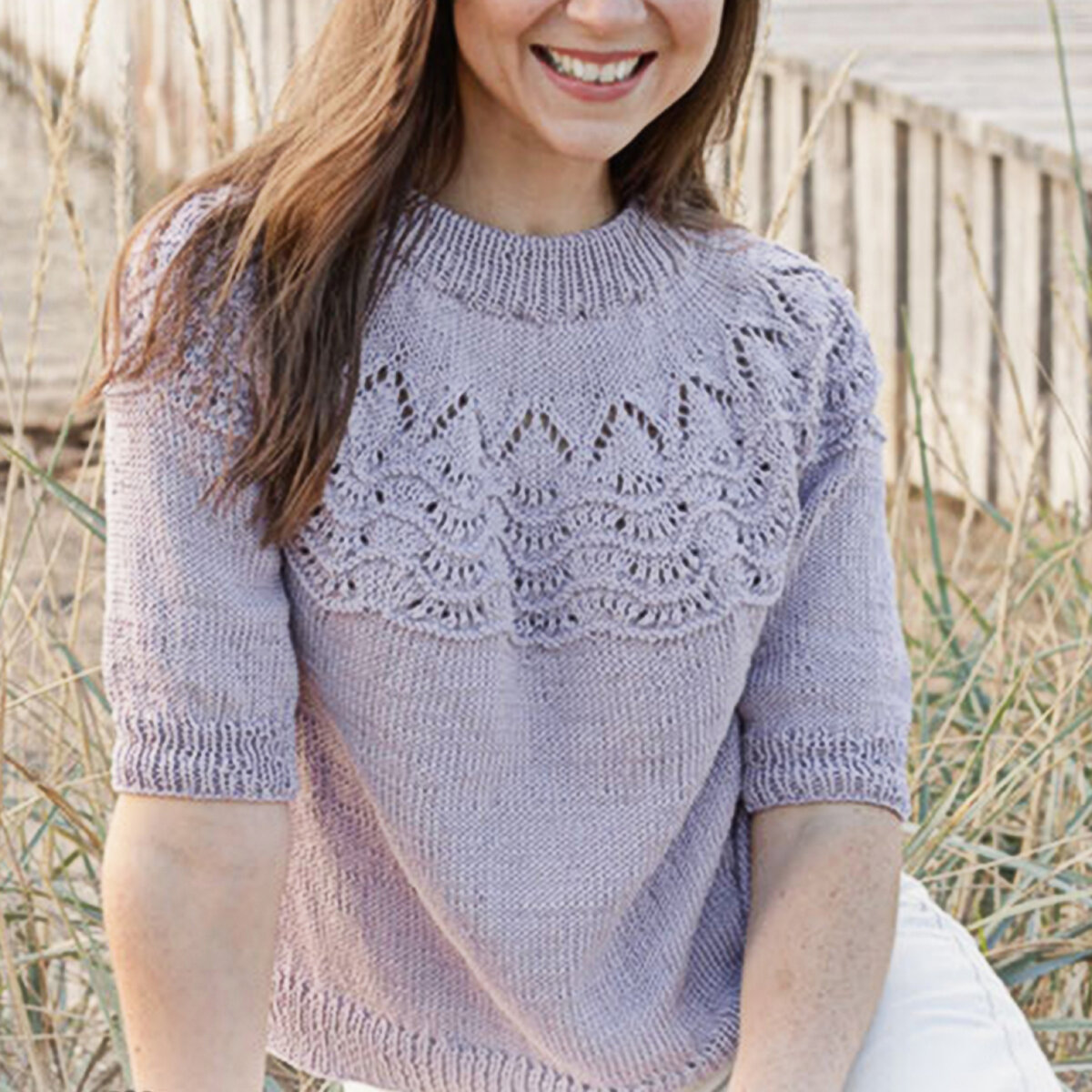 женщина в светло-фиолетовом вязаном свитере с узором улыбается на фоне сухой травы