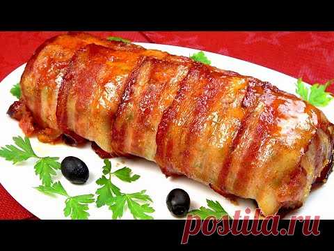 На изображении представлено блюдо, покрытое слоем жареного бекона, на белой тарелке украшенной петрушкой и черными маслинами. Еда выглядит аппетитно и, вероятно, является мясным рулетом или запечённым мясным блюдом.