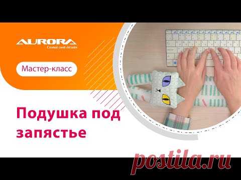 Изображение представляет собой рекламный макет или обложку с русским текстом. В верхнем левом углу лого "AURORA". На правой стороне изображено две руки, печатающие на клавиатуре, и рядом лежит необычная подушка под запястье в форме мыши с изображениями глаз и усов. Текст на изображении гласит: "Мастер-класс", "Подушка под запястье", а также упоминается веб-сайт "positiv.ru".