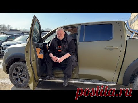 Мужчина сидит в открытой двери зеленого пикапа на парковке.
