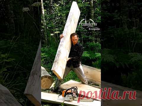 человек находится в лесу и держит деревянную доску, около него лежит бензопила