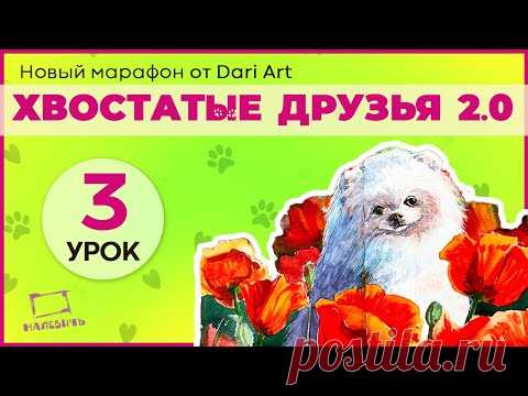Рекламный баннер марафона от Dari Art под названием "Хвостатые друзья 2.0". Изображение показывает милую собаку породы, возможно, мальтизе или другую маленькую белую собаку, на фоне красных маков. Это третий урок серии, и похоже, что марафон связан с рисованием или искусством.