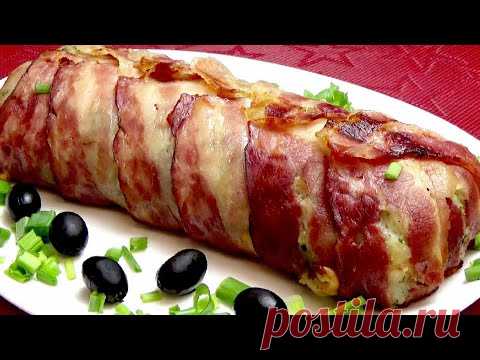 На изображении блюдо, которое выглядит как запечённый рулет, обернутый беконом, поданный на белой тарелке с зелёным луком и маслинами на фоне красной скатерти.