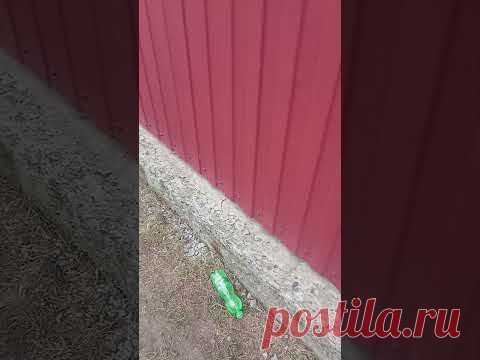 На земле около красной стены лежит зеленая пластиковая бутылка