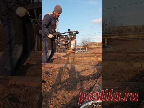 На изображении мужчина работает с мотобуром для бурения отверстий в земле. Это строительный инструмент, который используется для бурения под фундаменты или установки столбов. Мужчина работает вручную, на улице, возможно, занимается подготовкой к строительству или монтажу забора.