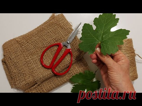 На изображении человек держит зеленый лист растения над мешковиной. Рядом лежат красные ножницы и клубок веревки.