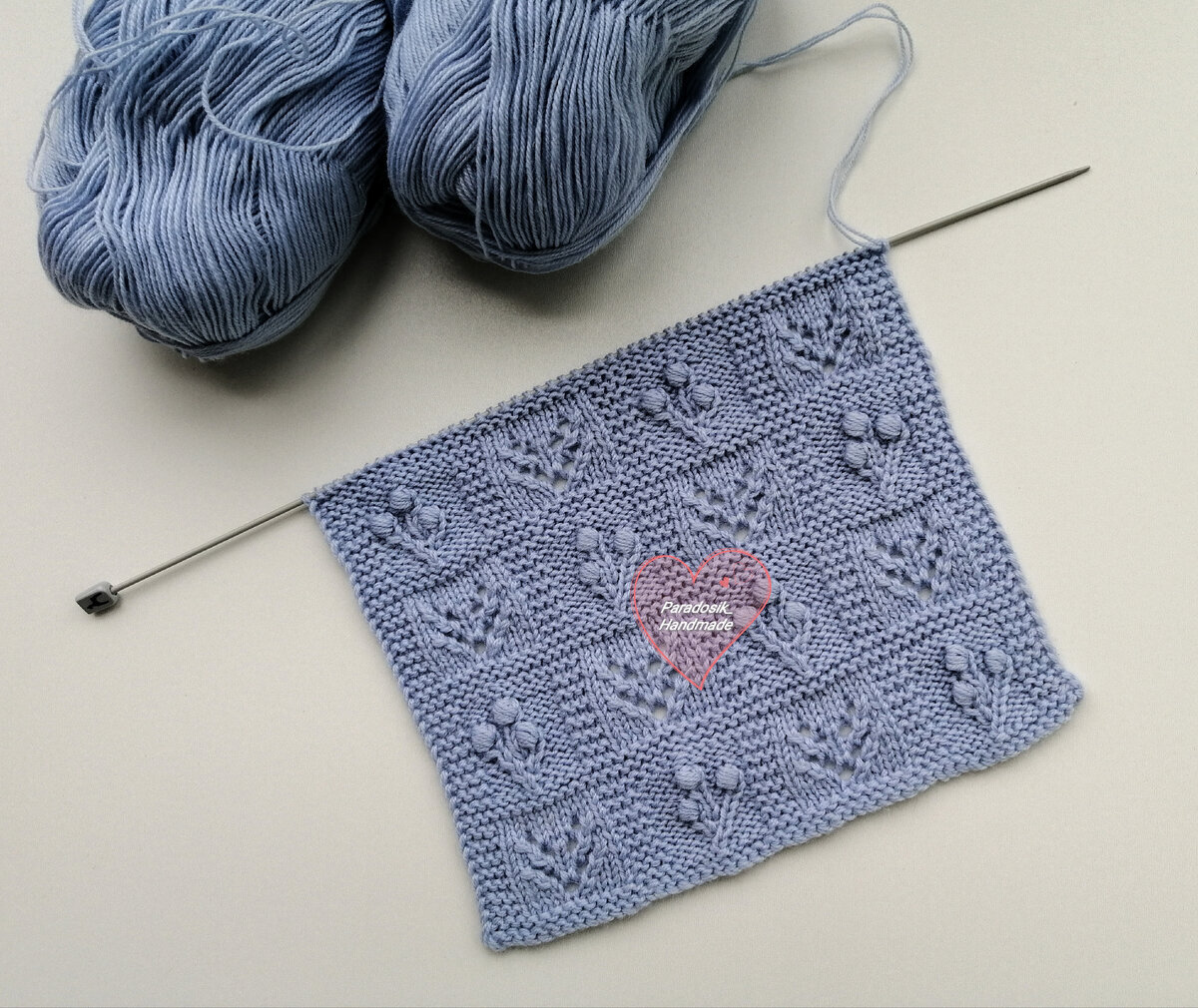 На изображении представлено вязаное изделие с узорами в виде цветов и сердца, рядом лежат два мотка голубой пряжи и вязальные спицы. Изделие находится на фоне светлой поверхности.