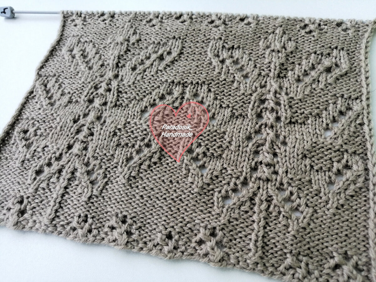 Вязаное изделие бежевого цвета с узором в форме листьев, представленное на белом фоне. В центре изображена небольшая ярлычок с надписью.