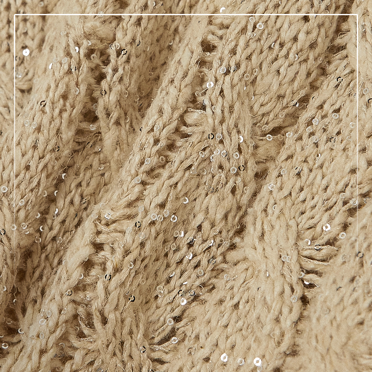 Крупный план вязаного материала бежевого цвета с вплетенными блестками или пайетками.