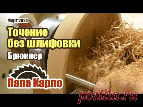 На изображении представлено оборудование для деревообработки, вероятно, токарный станок, с которого снимаются стружки. Видны текстовые элементы, указывающие на то, что это реклама или постер, озаглавленный "Точение без шлифовки" от "Брокер папа Карло". Также присутствуют дата "Март 2024" и логотип вебсайта в правом нижнем углу.