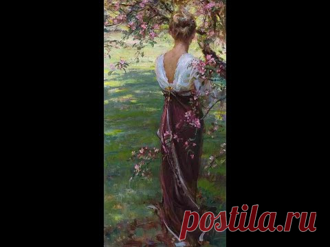 На картине изображена женщина, стоящая спиной в цветущем саду. Она одета в длинное винтажное платье с цветочным узором, рукава на ее платье легкие и прозрачные. Свет играет на ее волосах и листве деревьев, придавая изображению живописное настроение.