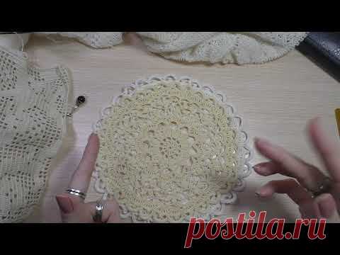 На изображении представлены руки человека, которые демонстрируют вязаную крючком салфетку. Салфетка лежит на столе, а вокруг неё видны другие вязаные изделия и предметы для вязания.