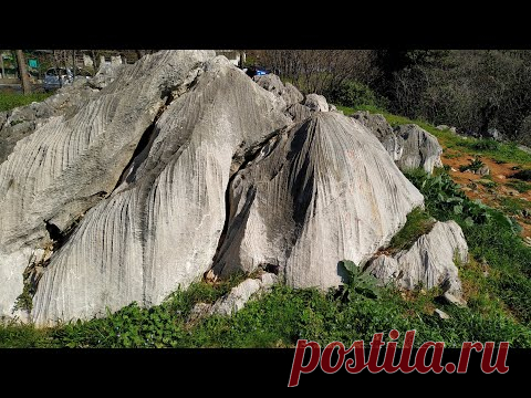 На изображении видны большие каменные скалы с выраженными вертикальными бороздами, возможно, это результат эрозии. Растительность видна вокруг скал, и кажется, что снимок сделан в дневное время с использованием дрона или иного вида воздушного фото.
