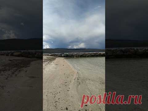 На изображении видна речка, текущая между песчаными берегами. Погода кажется переменчивой: небо над рекой частично затянуто тучами, но также видны участки с синим небом. Вдалеке виднеются горы.