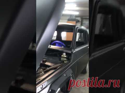 На фотографии изображен автомобиль, стоящий внутри гаража или автосервиса. Фотография сделана с таким углом, что основное внимание приковано к открытому капоту черного автомобиля, через который видна часть другого автомобиля серого цвета. Видны как детали двигателя, так и кузов автомобилей.