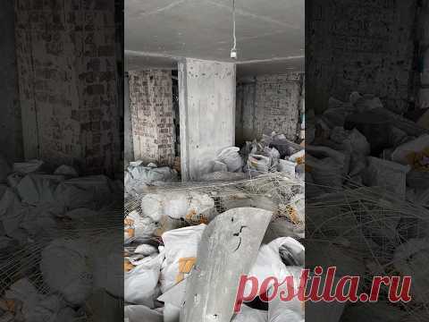 Незавершенное строительство с мешками строительного мусора и арматурой в помещении с бетонными конструкциями.