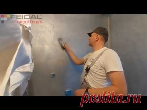 Человек в белой футболке и кепке наносит штукатурку на стену с помощью шпателя. В помещении, по-видимому, идет ремонт.
