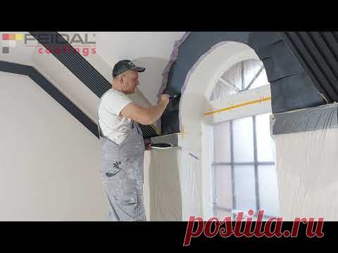 Мужчина работает над внутренней отделкой помещения. Он использует малярный инструмент для работы с обоями или покрытием стены. У мужчины надета защитная белая одежда, и он кажется профессиональным отделочником. Вокруг защищённая рабочая область с полиэтиленовыми покрытиями для предотвращения попадания краски или клея на близлежащие поверхности.