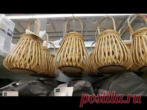 На изображении видно несколько подвесных светильников с плетеными из ротанга абажурами, выставленных на продажу в магазине.