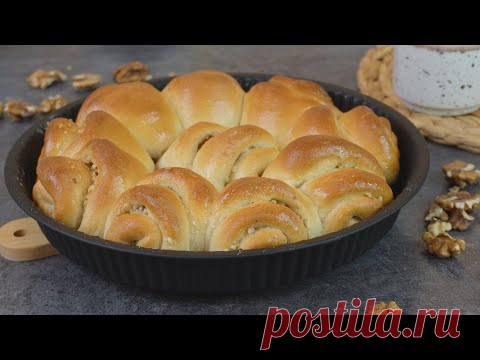В изображении представлена выпечка, которая похожа на сладкий плетеный хлеб или булочку, поданный в черной круглой форме для запекания. На заднем плане видны грецкие орехи и часть деревянной разделочной доски.