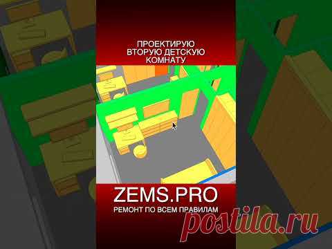 Компьютерное изображение дизайна интерьера, предположительно детской комнаты, с использованием программы для 3D-моделирования. Текст на изображении гласит: "Проектирую вторую детскую комнату ZEMS.PRO Ремонт по всем правилам" и указывает на рекламу услуг по дизайну интерьеров.