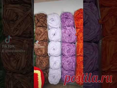 На изображении представлены рулоны цветной пряжи, упорядоченно разложенные на полке. Яркие цвета пряжи включают оттенки коричневого, фиолетового, оранжевого и серого, что указывает на магазин пряжи или рабочее пространство для вязания. Видеооригиналом для этого кадра, возможно, является контент из TikTok, так как видно их водяной знак.