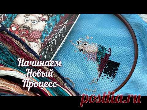 На изображении показана вышивка крестиком, которая находится в процессе создания и закреплена в пяльцах. Рядом разложены множество разноцветных ниток для вышивания. Текст на изображении гласит: "Начинаем Новый Процесс" и указывает на веб-сайт "postiia.ru".