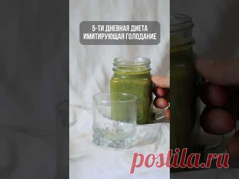 На изображении представлена стеклянная банка с зеленым содержимым, рядом стоит пустой стеклянный стакан, и видна рука человека, держащего несколько куриных яиц. Текст на изображении гласит: "5-ти дневная диета имитирующая голодание". Фон изображения - нейтральный, предположительно, кухонная среда.