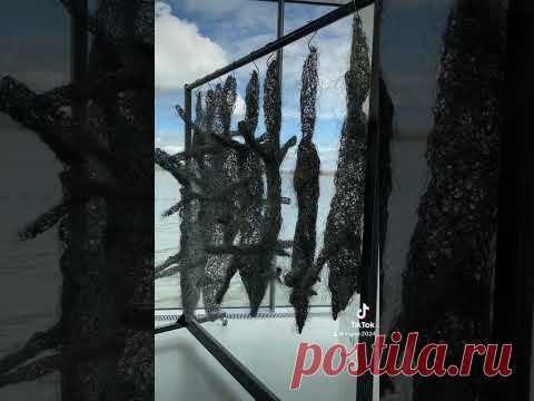 На изображении видна лестница с металлическими перилами, за которыми просматриваются металлические скульптуры, напоминающие фигуры людей. Скульптуры создают иллюзию отражения как в зеркале на фоне облачного неба и водной глади.