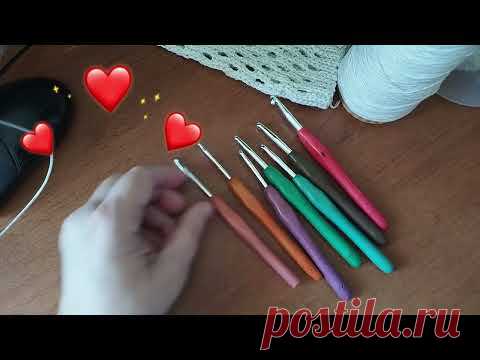На изображении виден стол, на котором лежат крючки для вязания различных цветов, а также клубок пряжи и компьютерная мышь. В воздухе над крючками парят анимированные сердечки.
