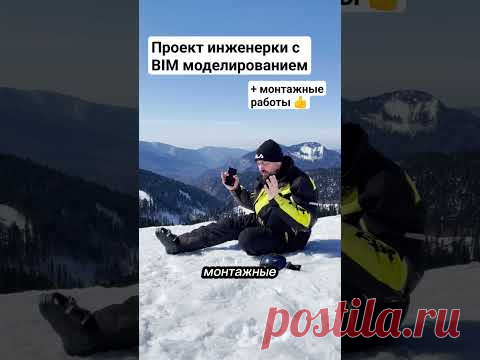 На изображении мужчина в зимней одежде сидит на снегу с горами в фоне. В его руках, кажется, находится какой-то прибор, возможно, камера или телефон. Текст на изображении на русском языке говорит о проекте инженерии с ВИМ моделированием и упоминает монтажные работы.