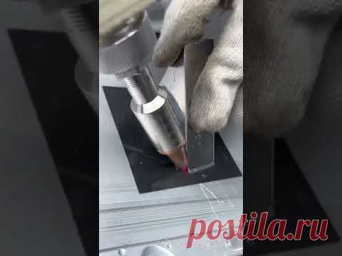 На изображении виден процесс обработки материала с использованием инструмента на станке. Оператор в перчатках управляет процессом. Кадр сфокусирован на рабочей зоне, где инструмент соприкасается с обрабатываемой поверхностью.