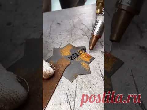 На изображении видна металлическая поверхность со следами коррозии, на которой лежит фигурная металлическая заготовка с острыми углами. Рядом расположен плазменный резак, который в данный момент вырезает текст на этой заготовке. Видны искры и пламя от процесса резки.