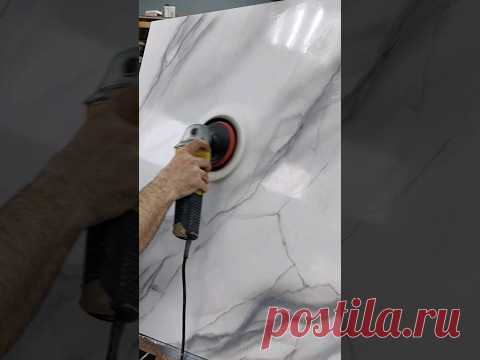 На изображении видно, как человек работает с шлифовальной машиной по каменной плите. Кажется, что процесс связан с обработкой или полировкой мрамора или другого декоративного камня.