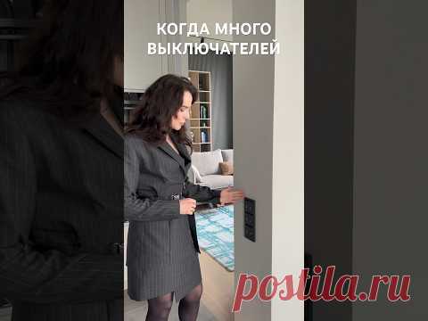 Женщина в пальто стоит рядом с рядом выключателей и кажется озадаченной. Надпись на изображении: "когда много выключателей". Виден дверной проем и часть интерьера комнаты.