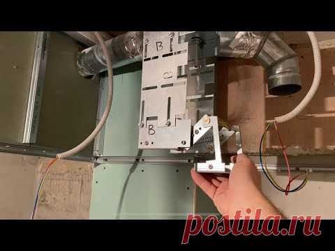 На изображении представлены компоненты системы вентиляции или кондиционирования. Видны воздуховоды и механические части, а также рука человека, устанавливающего или ремонтирующего оборудование. Провода и металлические крепежи также видны.