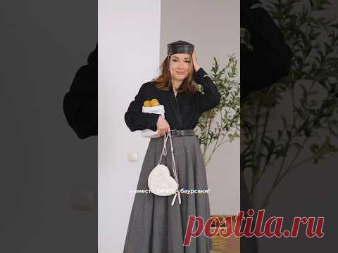 На изображении девушка в униформе, похожей на школьную или академическую одежду. Она носит черный верх с эмблемами на рукаве, серую юбку, чёрную шапочку и держит белую сумку в форме сердца. Девушка стоит рядом со столбом или частью стены, и на заднем плане видна зелень растения.