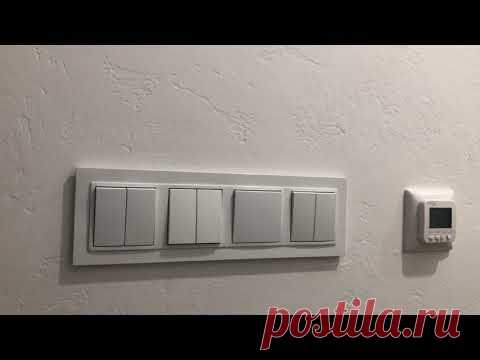 На изображении виден блок из пяти выключателей света, установленных на стене рядом с термостатом.