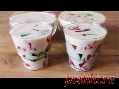 На изображении четыре стаканчика с фруктовым десертом или йогуртом, в который добавлены кусочки фруктов и ягод. Десерт выглядит как слоистый пудинг или желе, прослойки разноцветных фруктов и ягод красиво смотрятся на фоне молочного содержимого стаканчиков. Изображение сделано на кухонном столе.