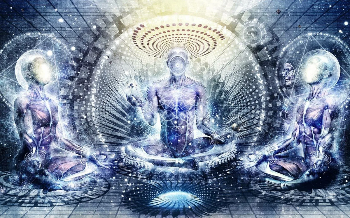 Изображение показывает стилизованное изобразительное искусство с тремя фигурами в позе лотоса в центре, которые кажутся окруженными аурами или энергетическими полями. Фигуры связаны с космическими или духовными мотивами, в том числе узоры, напоминающие мандалы и светящиеся паттерны, простирающиеся по всему пространству вокруг них. В верхней части изображения расположен водяной знак "postila.ru".