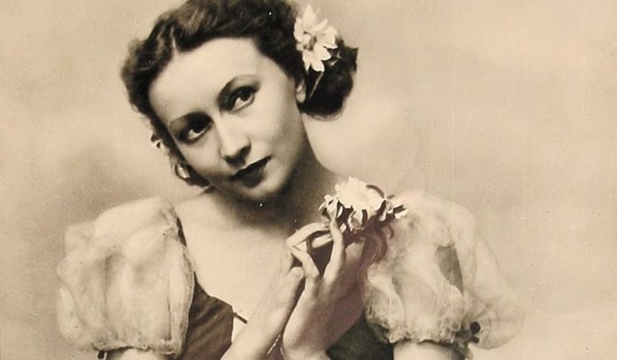 На изображении женщина средних лет с цветком в волосах. Она позирует перед камерой, держа цветок в руке. Она одета в одежду, которая может указывать на ретро-стиль, вероятно, это старинное черно-белое фото.