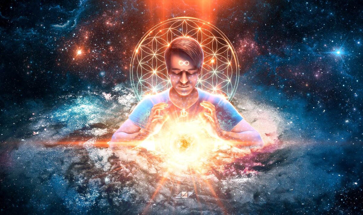 Изображение человека, сливающегося с космическим пространством, с элементами священной геометрии и мистицизма. В руках человека сконцентрированы яркие энергетические потоки. Фон - звездное небо с туманностями.
